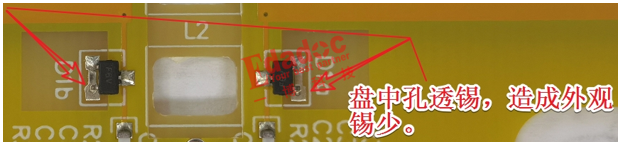 有過孔距SMD太近,因為錫球流經回流焊(Reflow)時部分的錫會因為毛細現象(wicking)流進導通孔而造成錫量不足,導致器件虛焊。